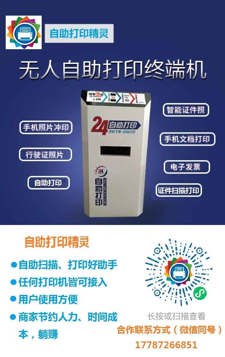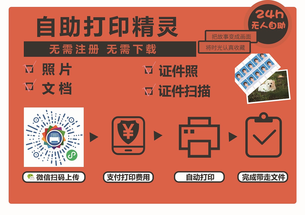 有集成的自助打印终端,可打印单面、双面、彩色、照片、证件照片等。
