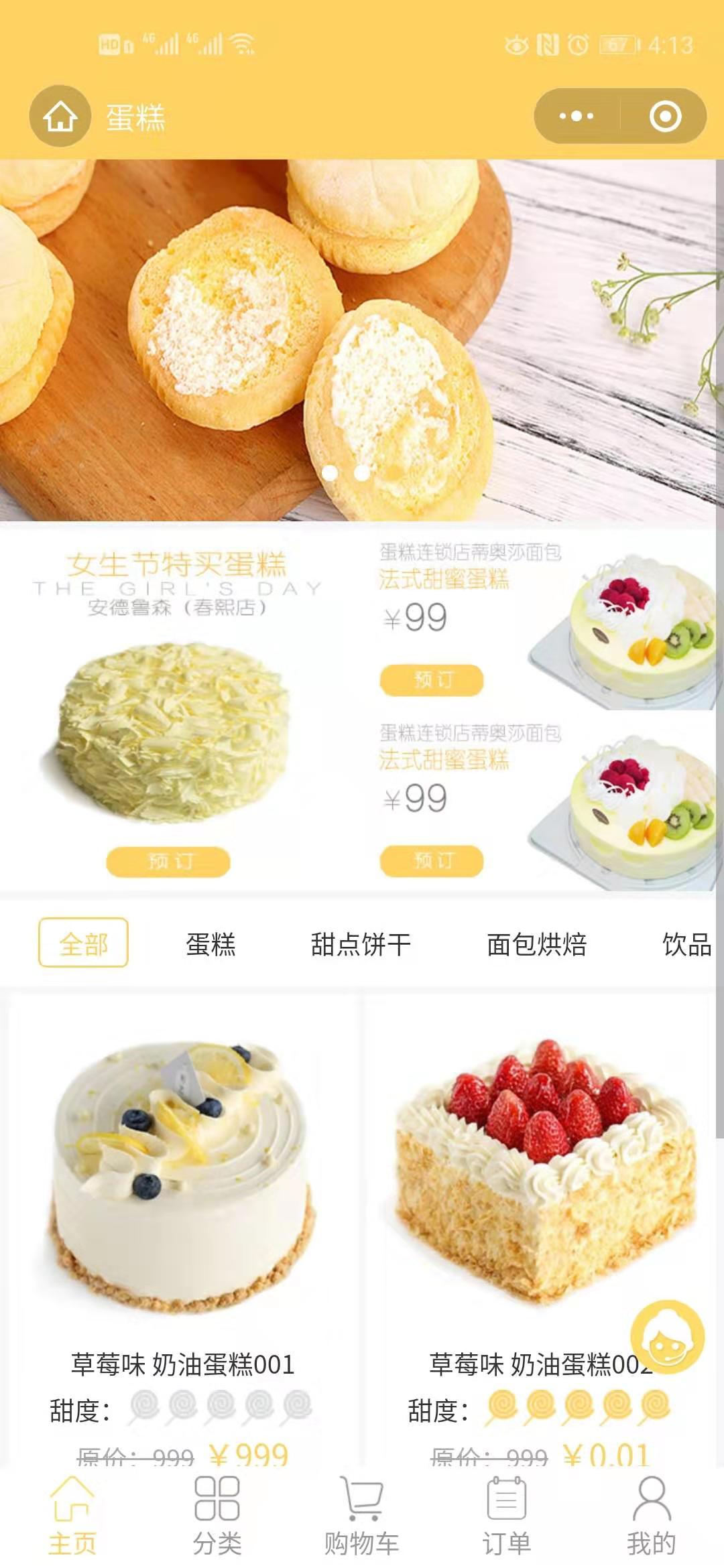 5、商品分类管理,如蛋糕、甜点、饼干、面包烘焙、饮品,用户可按商品分类快速查找商品。