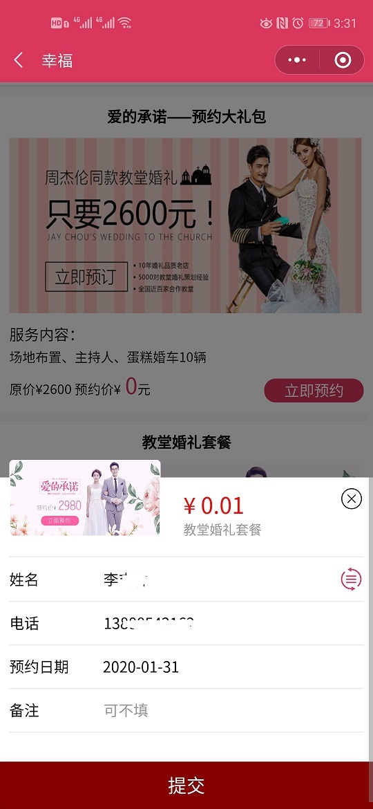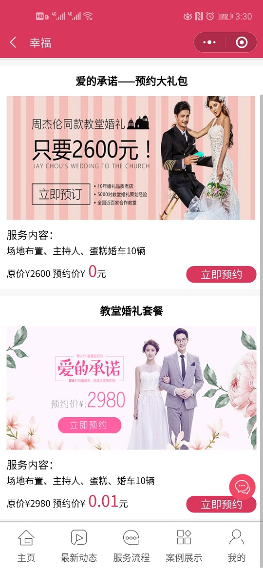 6、活动套餐管理,在支付购买,如教堂婚礼套餐(包括场地布置,主持人,摄影,婚车10辆)。