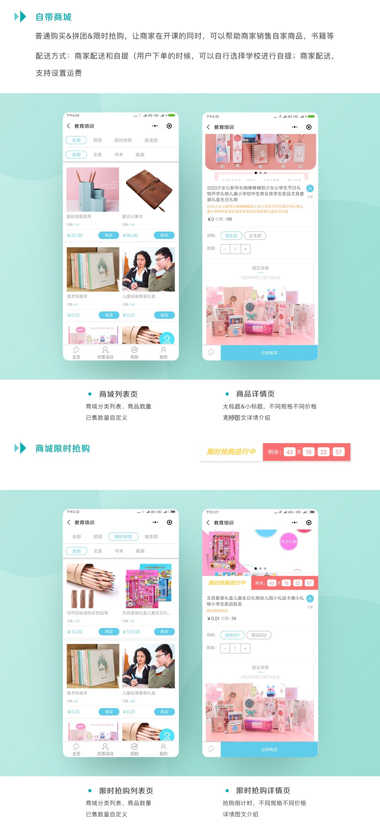 2、商品商城:可在平台里销售相关商品(如书、学习用具、陪练服务等你所属行业的商品),有商品分类管理,商品上下架管理、分销提成管理等。