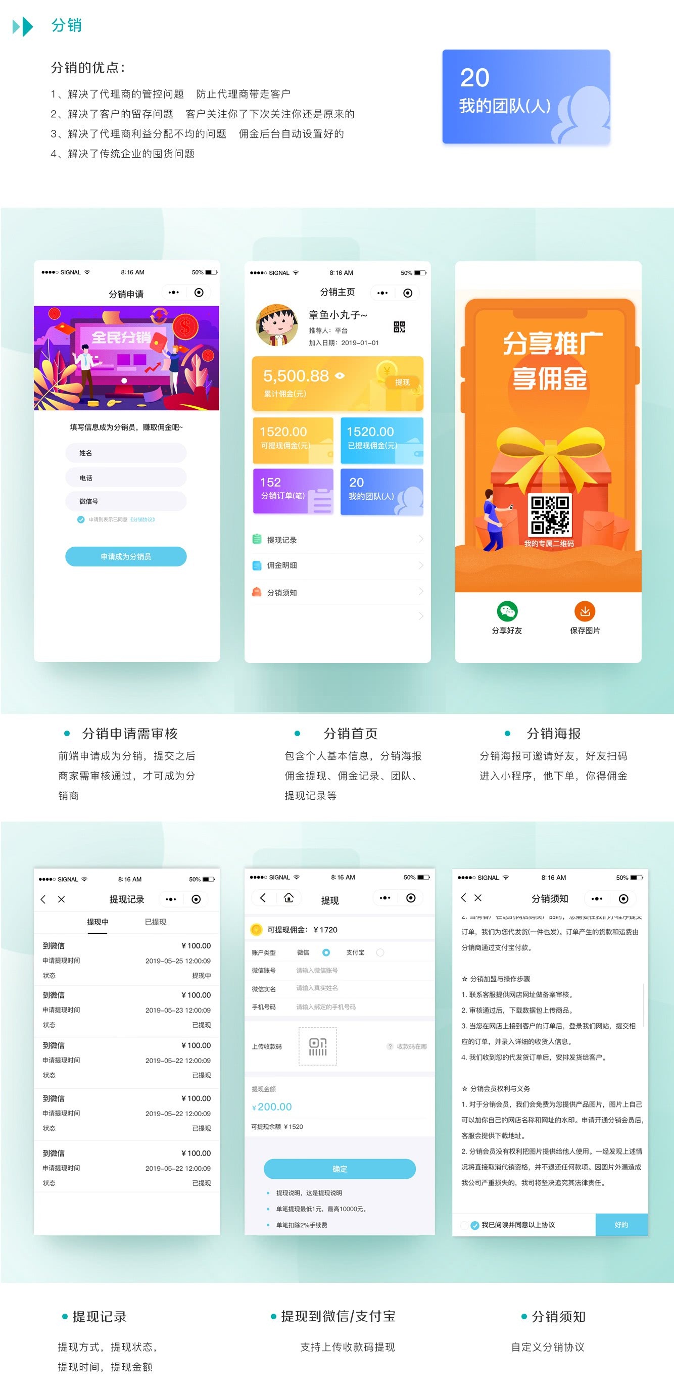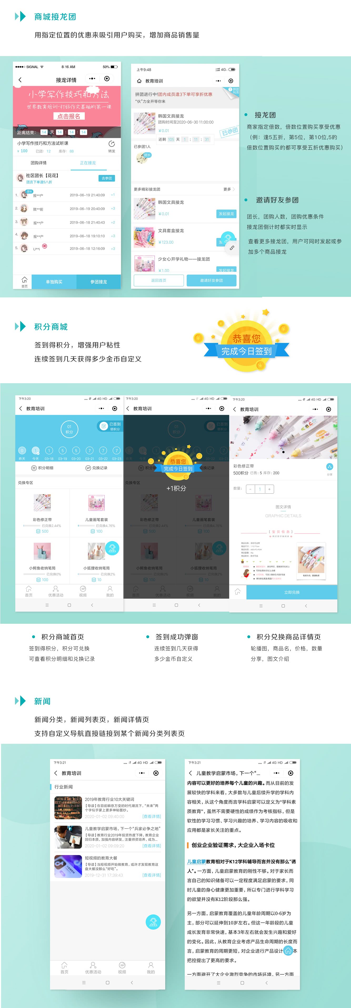 9、海报管理:课程海报、团购海报、砍价海报、音频海报、分销海报、活动海报、接龙海报自定义和管理。